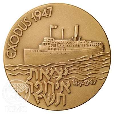 אקסודוס – הספינה שניצחה מדליה ממלכתית, תשמ"ז 1987 פני המדליה; אנית המעפילים אקסודוס. הכתובת "יציאת אירופה תש"ז 1947 Exodus" והתאריך 18.7.1947. עיצוב רות לובין. גלף תדהר דגן. החברה הישראלית למטבעות ומדליות בע"מ.
